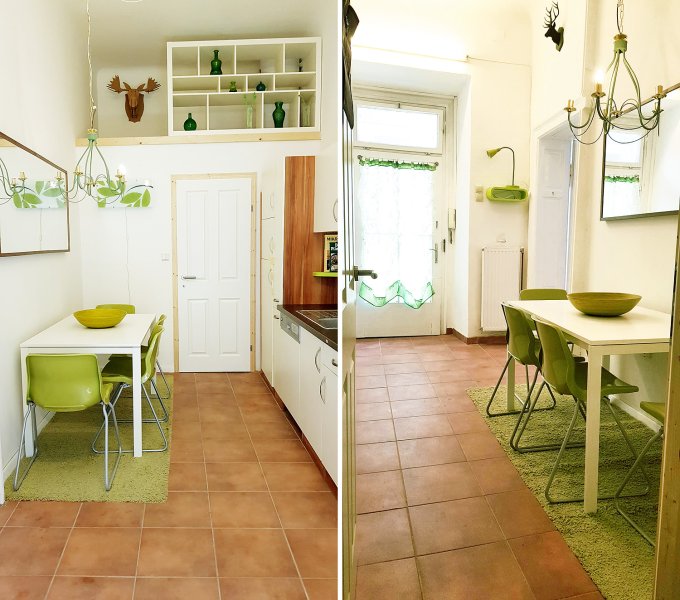 Die Altbauwohnung besteht aus Küche/Esszimmer, Wohnzimmer und Schlafzimmer, sowie Bad und Abstellkammer. Sie ist zur Gänze in den Innenhof ausgerichtet und liegt dadurch trotz der zentralen Lage (3 Minuten vom Jakominiplatz, Wielandgasse) sehr ruhig. Die Wohnung wird über einen verträumten, begrünten Laubengang betreten (siehe Fotos), der quasi als Balkon dient (kein Balkon im klassischen Sinn).