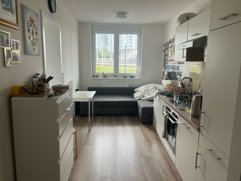 Es ist eine kleine 35m2 Wohnung mit einer Wohnküche und einem Arbeitszimmer. Es gibt kein Bett, aber 2 Schlafsofas.
