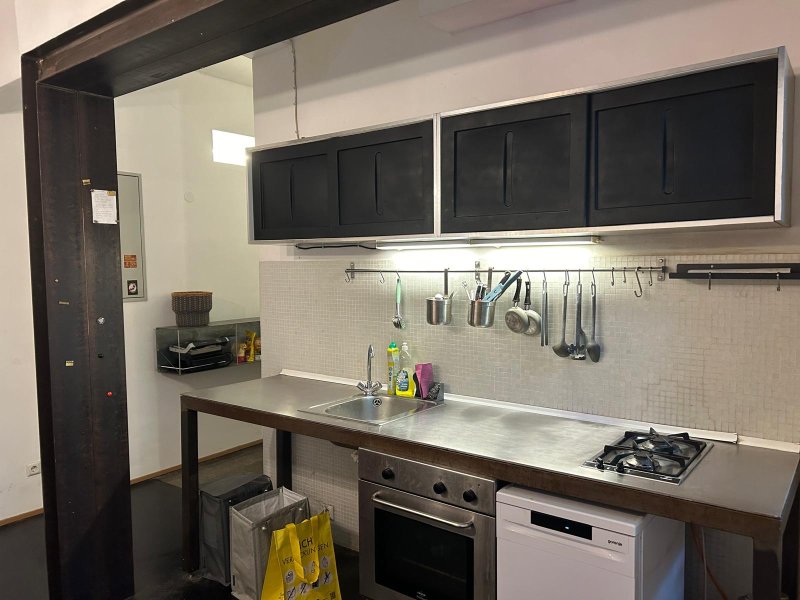 Küche verfügt über einen Herd und Wandschränke und einen großen, massgeschneiderten Küchentisch aus Naturholz. Geschirrspüler und Kühlschrank eventuell per Ablöse vorhanden (verhandelbar).