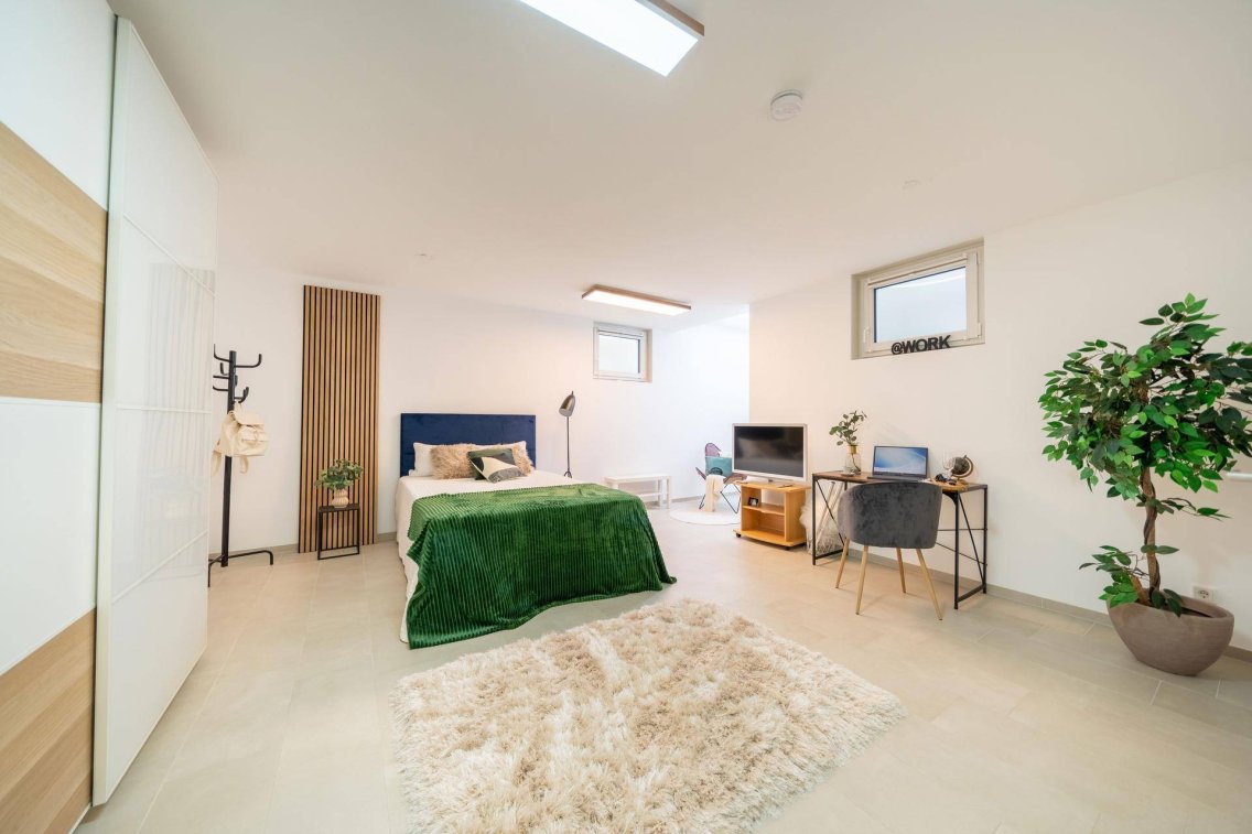 Derzeit noch ohne Küche, diese kann aber eingebaut werden. Derzeit teilmöbliert (ein modernes Boxspring-Bett, ein Sofa und ein Schrank), das kann auf Wunsch verändert werden.