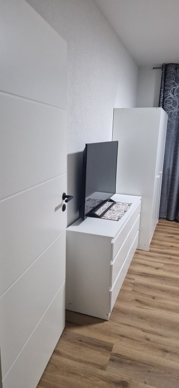 Möbliert mit Bett, Kleiderschrank, Kommode, Tisch, Stuhl und TV