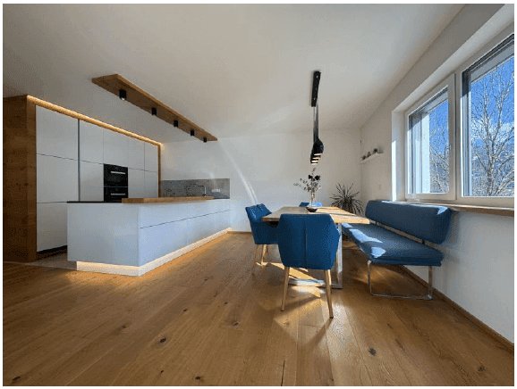 • Wohnzimmer 41m² inkl. Einbauküche, Kühlschrank, Dampfgarer, Backofen, Induktionsherd, Geschirrspüler (Miele Geräte), Esstisch, Bank, Sessel, Couch, Regale und Wohnwand.