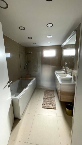 Das Bad ist eine reine Wohlfühloase mit einer Badewanne, separater Regendusche und 2 Waschbecken.