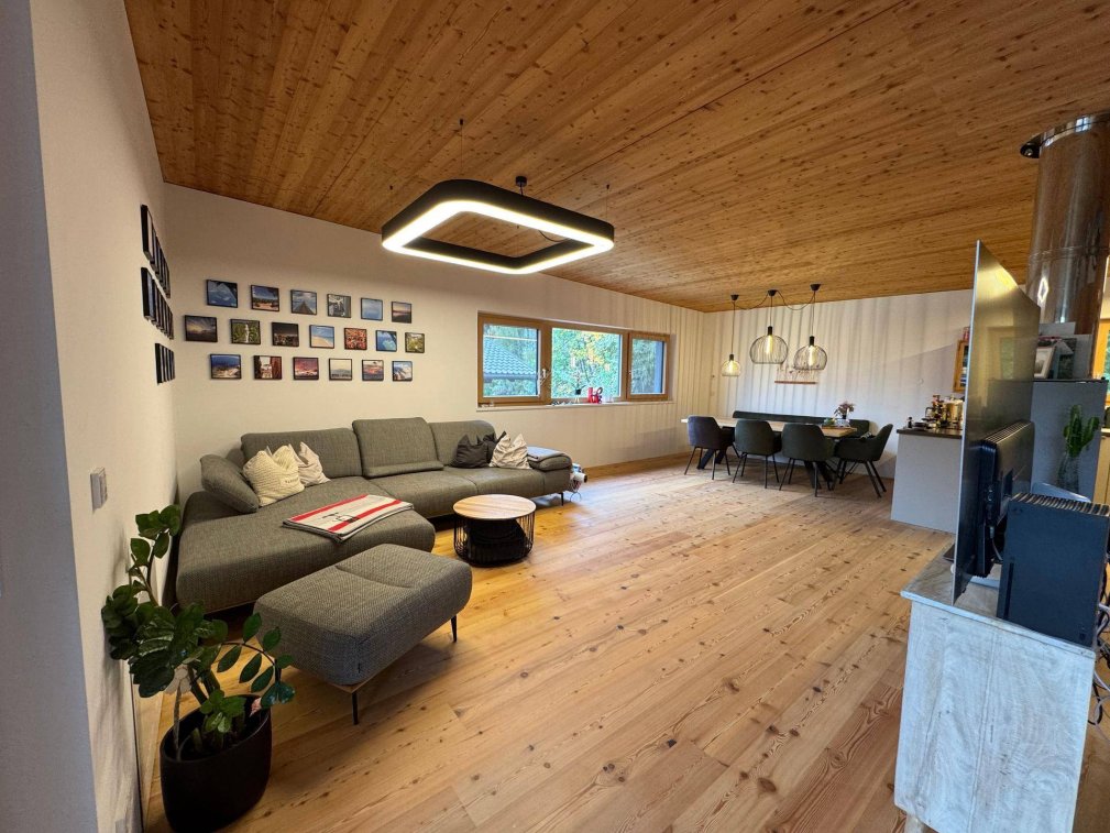 Der Wohn- und Essbereich ist im Obergeschoss der Wohnung mit Holzbauweise (Lärche).