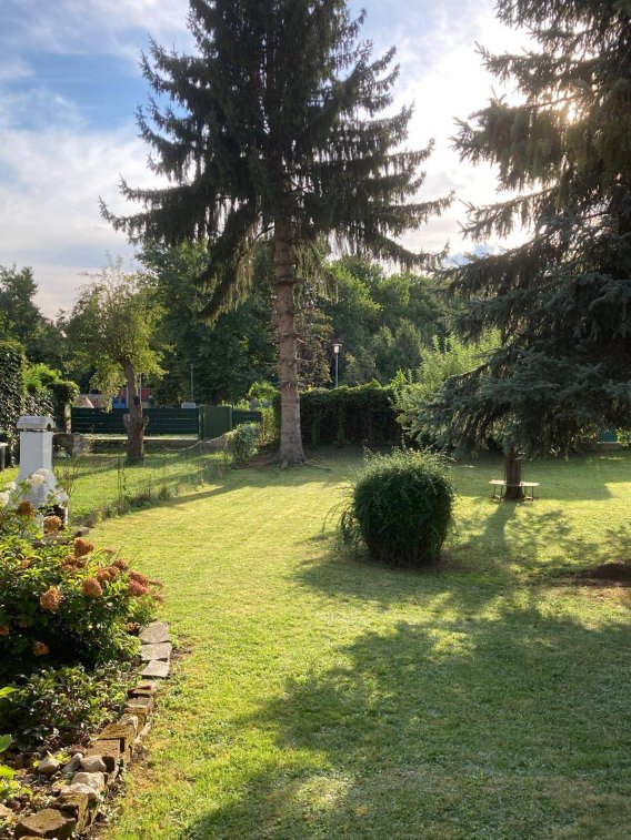 Der:die Bewohner:in kann den weitläufigen Garten mitnutzen, der viel Platz für Entspannung und Freizeitaktivitäten im Freien bietet.
