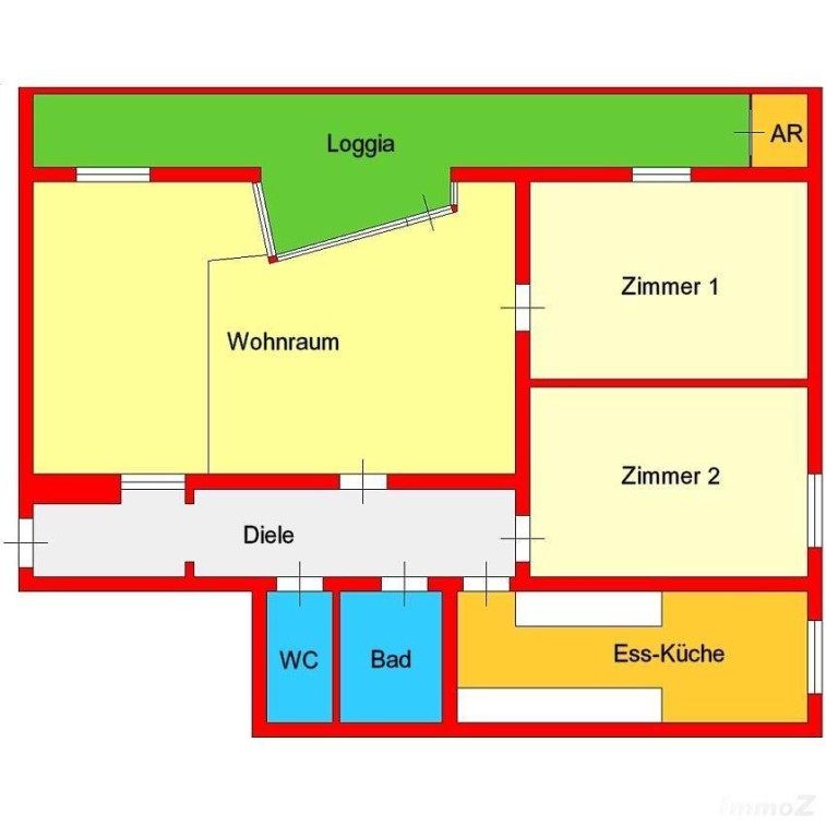 Sie besteht aus Diele, Wohnraum mit Terrassen-Loggia, zwei extra begehbaren Zimmern, möblierter Ess-Küche, Duschbad und WC.