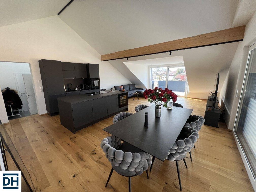 In absoluter Premiumlage in Bergheim, befindet sich im neu errichteten Dachgeschoß diese extravagante Penthousewohnung. Die Lage direkt an der Fischach, mit atemberaubenden Blick auf den Voggenberg, Untersberg, Maria Plain, ist einzigartig. Lichtdurchflutete Räume mit bis zu 4 Metern Raumhöhe mit großen Fenstern und Türelementen, lassen keine Wünsche mehr offen. Das modern gestaltete Architektenhaus besteht insgesamt aus nur 4 Wohnungen und einer Büroeinheit. Im Aussenbereich gibt es Carports und einen Fahrradraum, wo von ein Carport und ein Freistellparkplatz zur Wohnung gehören. Die Wohnung liegt im zweiten und obersten Stock und ist bequem mit dem Aufzug zu erreichen. Hervorzuheben ist der großzügige, helle, Wohn- Koch-Essbereich mit zwei großen Hebeschiebetüren. Die moderne Venda Küche ist ausgestattet mit hochwertigen Geräten, wie zB. Induktionsherd, Kühl-/Gefrierkombi einem Miele Backofen und verfügt sogar über einen Weinkühler, hier macht kochen Spaß.Aufteilung der Wohnung: Vorraum Fliesen, 4,19m²WC, Fliesen 1,92m²Schlafzimmer, Eiche Echtholzdielen 14,53m²Badezimmer, Fliesen, 7,98m²Kochen Essen Wohnen 44,60m², Eiche EchtholzdielenAbstellraum 3,45m²Balkon/Terrasse Süd 13,28m², FeinsteinzeugÜbersicht:2 Zimmer Penthousewohnung 2.OG Dachgeschoß-Neuaufbau76,67m² Wohnfläche, 86,80m² Nutzfläche (Fußbodenfläche)PersonenaufzugEin zugehöriger Carportstellplatz mit Leerverrohrung für E-LadestationEin zugehöriger FreistellparkplatzInkl. Kellerabteil 5,25m²Großzügige Balkon/Terrasse mit 13,28m² FlächeFussbodenheizung über Pelletszentralheizung, zusätzlich PV AnlageKlimaanlage im Wohnbereich vorbereitetBäder und WC möbliert mit hochwertiger Ausstattung.Hochwertige Echtholzdielen in Eiche,gehobelt, geölt und Feinsteinzeug/Fliesen grau 120x60cm in Bädern und Vorräumen3 Phasenschienen für Ledbeleuchtung ausgeführt.VermietungMietbeginn: ab 01.10.2025KostenGesamtmiete Euro 1.690inkl. Betriebskostenakonto, Mwst.,Heizungs und Warmwasserakonto (gesamt Akonto Euro 216,26.-mtl.)Kaution: 4BMM: Euro 6760.-Lage-Infrastruktur:Durch die günstige Stadtrandlage
