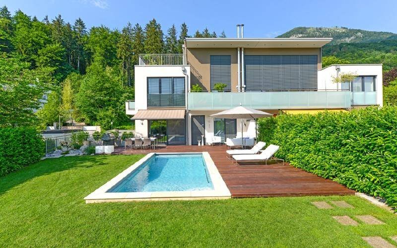 Im sonnigen Garten sorgt der elegante Pool für Abkühlung an heißen Sommertagen und ist alternativ auch mittels Wärmepumpe beheizbar. Die stylische Klafs-Sauna im Gartenhaus macht Wellness zuhause komplett. Für Ihren Pkw stehen zwei Tiefgaragenstellplätze zur Verfügung. HWB 26