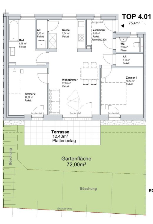 Die Wohnung verfügt über drei Zimmer und ein Badezimmer mit Badewanne. Zur Ausstattung gehören eine Einbauküche, Parkettböden und eine Fußbodenheizung mit Luftwärmepumpe. Ein besonderes Highlight ist der Garten, der den Wohnraum ideal ergänzt und zusätzlichen Freiraum bietet.
