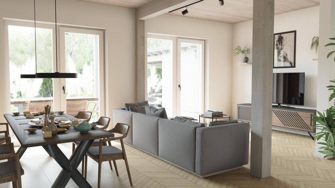 Im Erdgeschoss erwartet Sie ein offener Wohn- und Essbereich mit eleganter Abtrennung zur Küche, ergänzt durch Gäste-WC, Technikraum und Abstellraum.