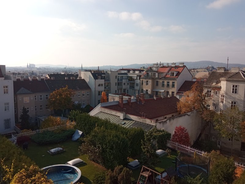Uneinsehbare 68 m2 und 12m2 Dachterrasse in Richtung Westen, Lift, Kellerabteil, beste Infrastruktur (Supermarkt, zwei Straßenbahnlinien, Nähe zur U-Bahn, 15 Minuten mit der Straßenbahn in die Innenstadt, 5 - 10 Autominuten zu den Weinbergen und in den Wienerwald ...), Zimmer nicht getrennt begehbar ; Dachbodenausbau 1993 - 95 in Jahrhundertwendehaus; BK inkl. Rücklagen und Lift 330.-