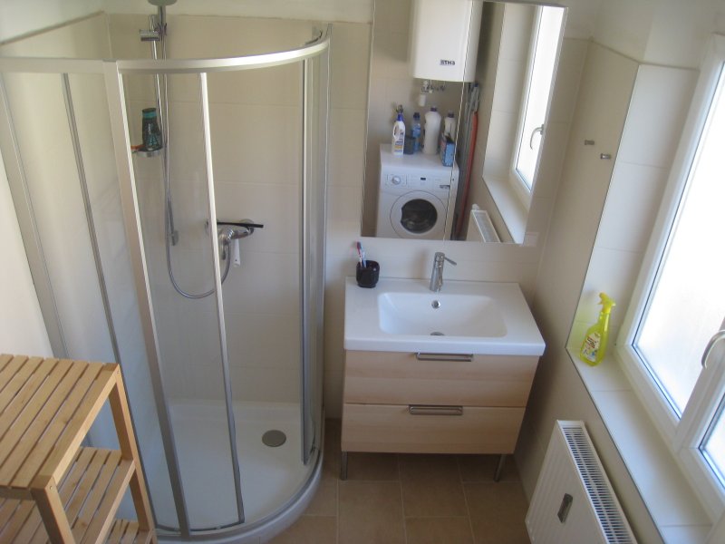 Bad möbliert mit Duschkabine, Waschtisch, Spiegelschrank, Boiler.
