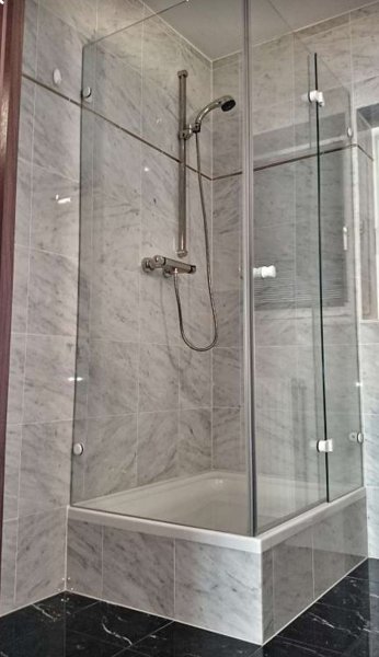 Bad und WC getrennt jeweils mit Fenster zum Öffnen. Feinster Carrara-Marmor über die volle Raumhöhe.