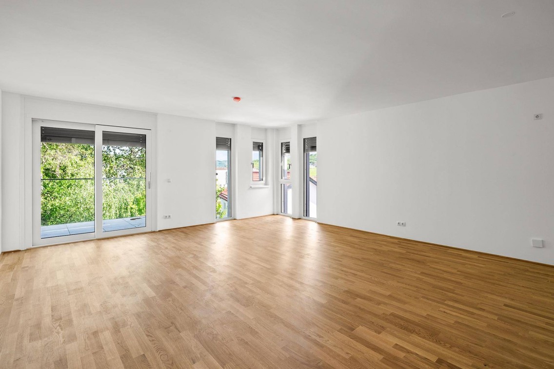 Diese herrliche Erstbezug-Wohnung bietet mit hochwertiger Ausstattung modernen Wohnkomfort und einen traumhaften Ausblick ins Grüne. Die hervorragende und idyllische Lage sorgt für Urlaubsgefühle sowie wunderbare Erholung für jeden Tag im neuen Zuhause! In zentrumsnaher Lage wurde diese attraktive Wohlfühl-Wohnung in einem neu errichteten Wohnhaus in modernem Design geschaffen. Sie bietet 3 geräumige Zimmer und ist die perfekte Kombination aus moderner Ausstattung und natürlichem Charme. Sie wurde mit hochwertigen Materialien gebaut und überzeugt durch eine hochwertige Qualität in allen Bereichen. Die kürzlich fertiggestellte Wohnung wird als exklusiver Erstbezug angeboten und besticht mit ihren hellen Räumlichkeiten mit Ausblick ins Grüne ebenso wie mit ihrer komfortablen Ausstattung. Rund 84 m² bieten ausreichend Platz für Ihre individuelle Gestaltung. Der helle Wohn-Essbereich mit Ausgang auf den Balkon ist perfekt zum Genießen und Entspannen. Der sonnendurchflutete Raum lädt mit seinem entspannten Ambiente und seiner Vielfalt an Nutzungsmöglichkeiten zum Verweilen ein. 2 geräumige Schlafzimmer bieten viel Platz für eine junge Familie oder Paare. Das Badezimmer mit den geschmackvollen Feinsteinzeug- und keramischen Fliesen sowie ein praktischer Abstellraum vervollständigen die Wohnfläche. Die moderne Ausstattung, hochwertige Materialien, Weitzer-Parkettböden sowie dreifache Schallschutz-Isolierverglasung garantieren hohen Wohnkomfort. Alle Fenster und Fenstertüren in den Wohnungen haben eine Außenbeschattung. Für Energieeffizienz sorgt die hauseigene Luftwärmepumpe am Dach. Von dieser erfolgt die Warmwasseraufbereitung und Heizung. In den Badezimmern ist der Heizkörper als Handtuchtrockner ausgeführt. Die Steuerung der Temperatur erfolgt über Thermostatventile. In den Kellerräumlichkeiten ist der Wohnung ein funktionelles Abteil zugeordnet. Für weiteren Komfort sorgt die hausinterne Tiefgarage, in welcher Stellplätze für EUR 19.500,- erworben werden können.