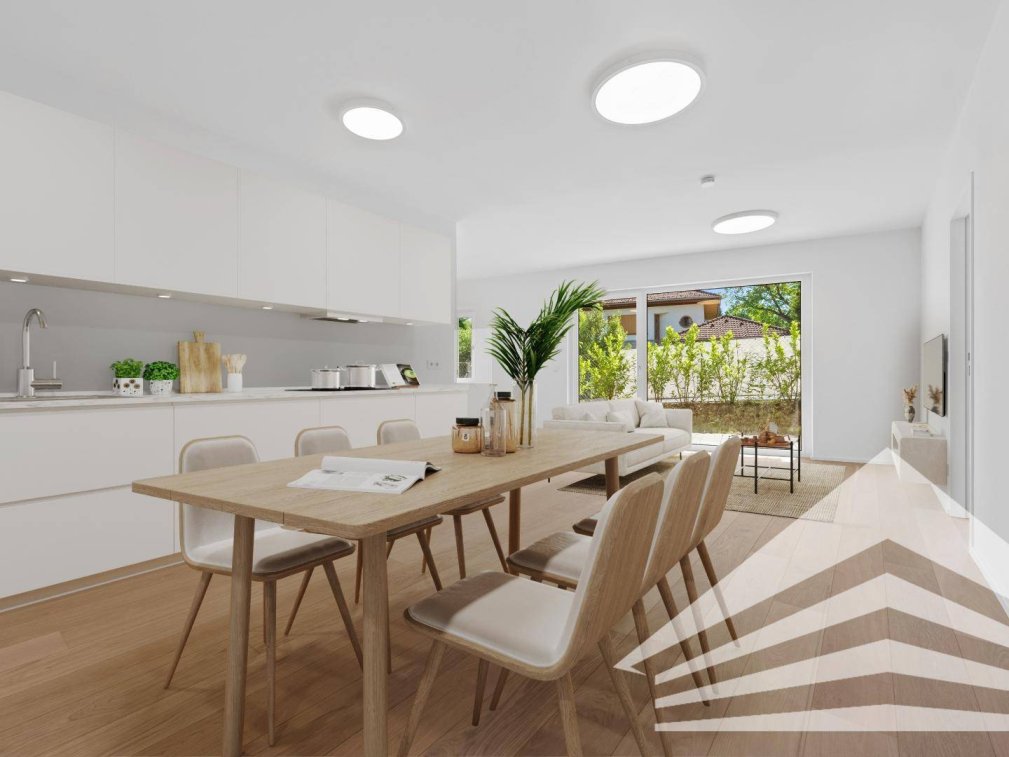 > Wohn-/Esszimmer mit offener Küche und Zugang auf die sonnige Terrasse & Eigengarten