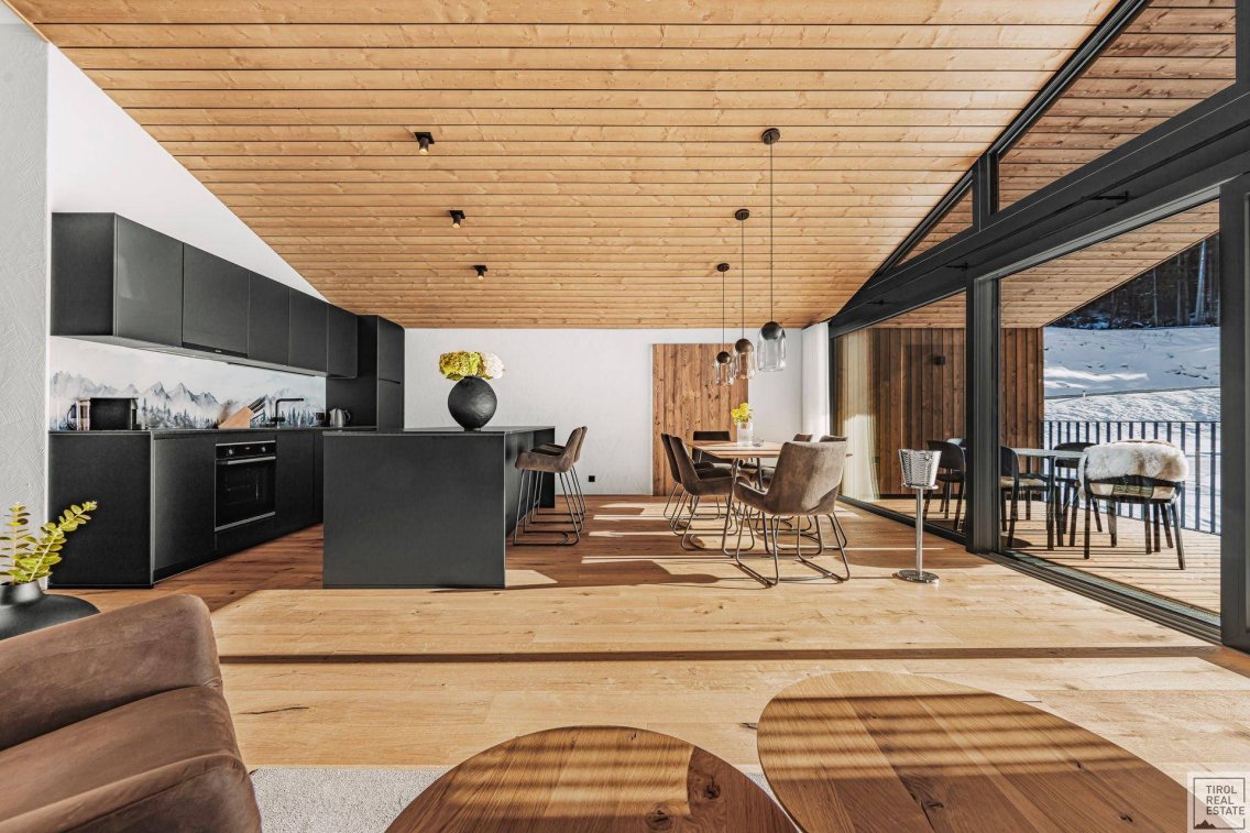 Der offene Wohn- und Essbereich überzeugt mit einer traumhaften Panoramafensterfront, die einen unvergesslichen Blick auf die malerische Berglandschaft freigibt. Die moderne Markenküche ist nicht nur ein optisches Highlight, sondern auch funktional perfekt ausgestattet.