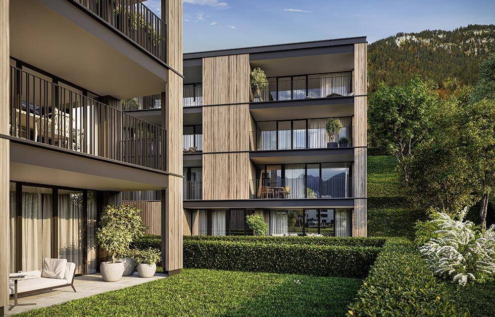 Mit dem Projekt Grete-Gulbranssonweg werden in schöner, grüner Lage in Bludenz zwei Baukörper mit variantenreichen 2- bis 4-Zimmer Eigentumswohnungen verwirklicht. Die formgebende Architektur in Kombination mit der Holzfassade, den bodentiefen Fenstern und den dunklen Staketengeländern an den großzügigen Terrassen, ergeben ein stilvolles Gesamtbild. Der Übergang vom Hang zu den beiden Wohnhäusern erfolgt fließend und sorgt so für die harmonische Eingliederung in die wunderschöne Umgebung. Im Inneren der Wohnungen sorgt die hochwertige ZIMA-Grundausstattung für zeitlose Eleganz und höchsten Komfort.