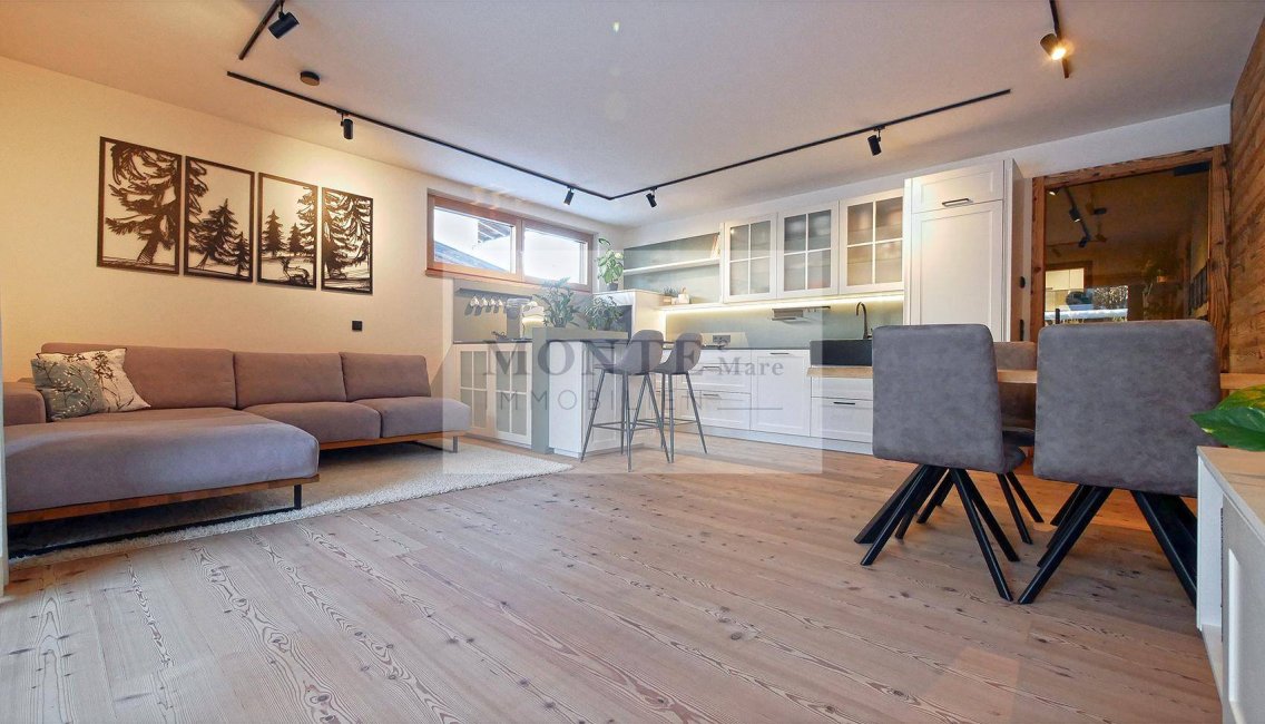 Das gemütliche Wohnzimmer mit integrierter Landhausküche und kleinem Tresen lädt zu geselligen Abenden ein. Die hochwertige Ausstattung der Wohnung lässt keine Wünsche offen: Einbauschränke bieten optimalen Stauraum, während die Altholzvertäfelungen und der Echtholzboden für eine warme, einladende Atmosphäre sorgen.
