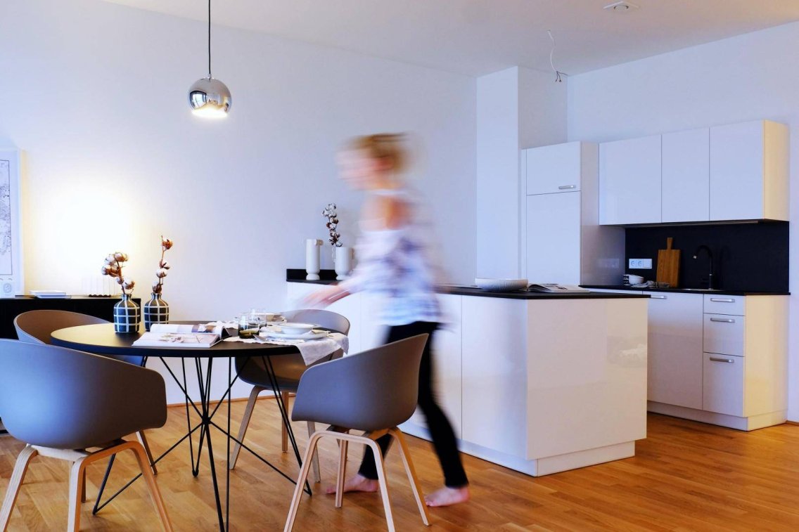 Eckdaten: Wohnfläche mit 80 m2, Wohn-Ess-Küchenbereich samt Speisekammer mit rund 33 m2, Terrassenfläche mit 16 m2. Die Wohnung befindet sich im 1. Obergeschoss. Aufgrund einer doppelten Raumhöhe im Erdgeschoss liegt diese Wohnung „gefühlt" im 2. Stock.