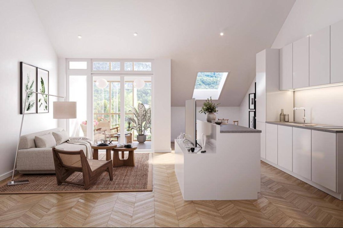 Qualität aus Leidenschaft: Im Inneren des Neubauprojekts steht hochwertiges Wohnen im Mittelpunkt: edle Materialien, zeitloses Design und eine durchdachte Ausstattung erzeugen ein behagliches Wohngefühl. Großformatige Glaselemente sorgen für viel Tageslicht und schaffen ein offenes Wohnambiente, während elegante Eichen-Massivholzböden für natürliche Wärme und Stil stehen. Die Nassbereiche sind mit exklusiven Marken-Armaturen von Hansgrohe sowie Villeroy & Boch sowie großflächigen Fliesen ausgestattet – ein klares Statement für moderne Architektur.