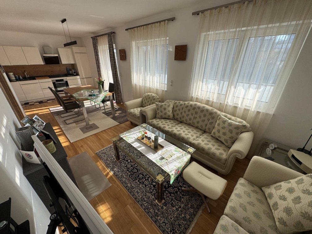 Einkaufsmöglichkeiten, Schulen, öffentliche Verkehrsmittel und Freizeiteinrichtungen sind in wenigen Minuten erreichbar.Auch das Naturschwimmbad in Jagerberg befindet sich in direkter Nähe. In nur ca. 25 Autominuten erreichen Sie außerdem die Ortschaften Feldbach und Leibnitz.Die Wohnung umfasst ca. 78 m² und untereilt sich wie folgt:• Gang 8,34 m²• separates WC 1,77 m²• Badezimmer mit Dusche und Fenster 6,66 m²• Abstellraum 1,79 m²• große, helle Wohnküche 31,20 m²• 2 Schlafzimmer 15,78 m² und 12,52 m²Highlights der Wohnung:• ca. 78 m² Wohnfläche• Großzügiger überdachter Balkon mit schönem Ausblick und elektrischem Sonnenschutz• Helles Wohnzimmer mit Ethanolofen und direktem Zugang zum Balkon• Moderne, hochwertige Einbauküche• Zwei gemütliche Schlafzimmer• Die Einrichtung wurde komplett nach Maß vom Tischler angefertigt• Badezimmer mit Dusche und Fenster• 2 Carport-Stellplätze• Sonnige Hanglage, ruhig und dennoch zentralAuflistung Betriebskosten monatlich:Betriebskosten: € 144,94