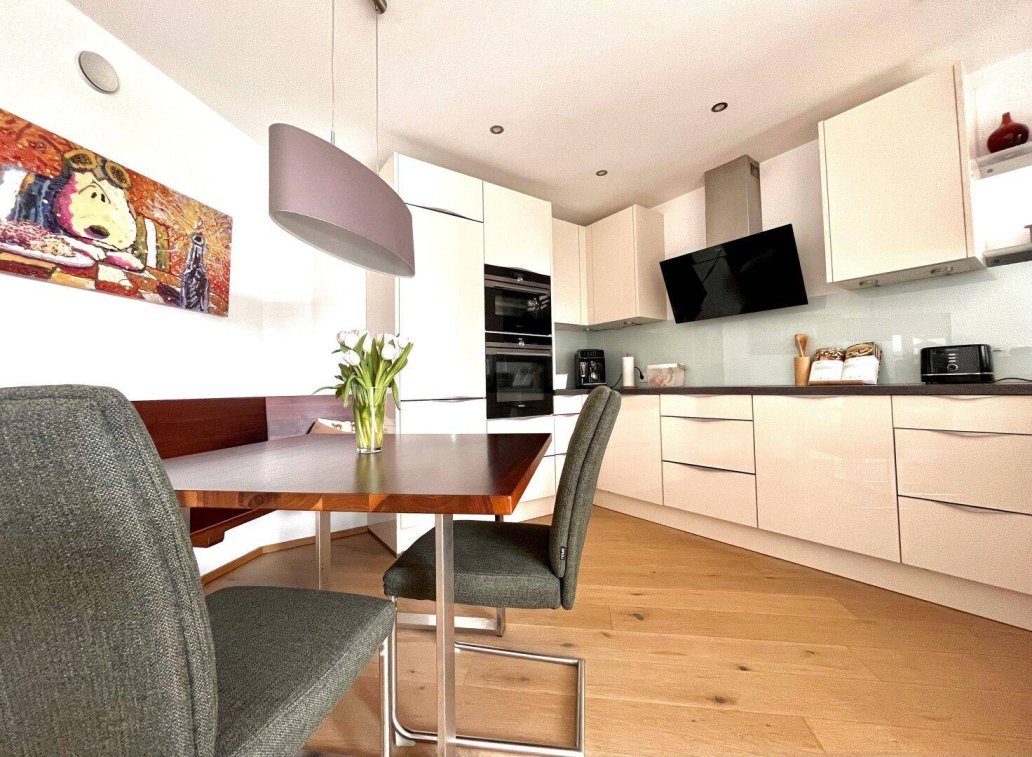 Im Herzen der Wohnung befindet sich die großzügige Wohnküche, die Kochen, Essen und Wohnen elegant miteinander verbindet. Die moderne Einbauküche mit hochglänzenden Fronten, hochwertigen Geräten und einem stilvollen Design lädt zum Kochen mit der Familie ein. Direkt daneben befindet sich der Essplatz mit gemütlicher Eckbank und Esstisch. Der Wohnbereich bietet Platz für eine Couchlandschaft und öffnet sich durch eine breite Fensterfront zur Terrasse.Über den Wohnbereich gelangen Sie auf die ca. 15 m² große Terrasse – hier können Sie entspannte Sonnenstunden, ein Frühstück im Freien oder gemütliche Grillabende genießen. Der Garten mit 40 m² bietet Platz für Blumenbeete, einen Kinderspielbereich und einen kleinen Gemüsegarten.