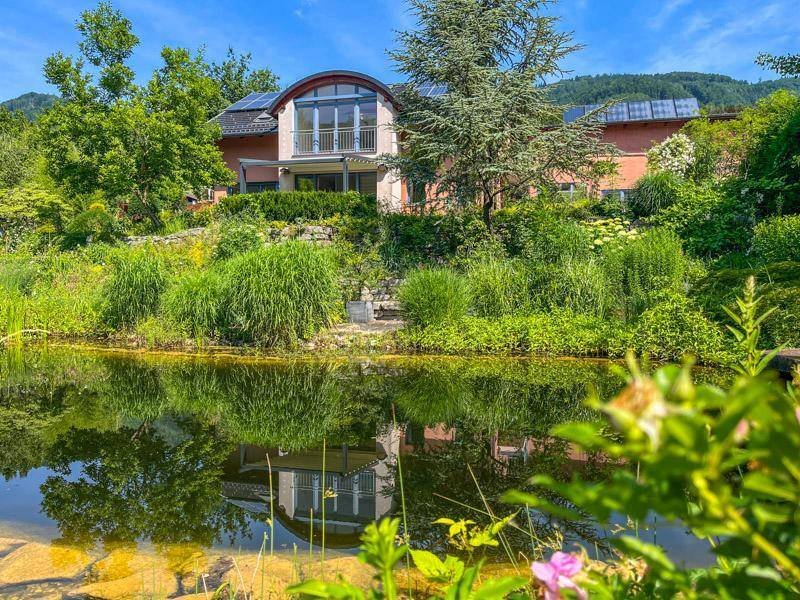 Dieses großzügige Einfamilienhaus vereint durchdachte Architektur mit einem besonderen Naturerlebnis. In ruhiger Siedlungslage gelegen – und dennoch von einem Gefühl wohltuender Abgeschiedenheit getragen – bietet es beeindruckende Ausblicke auf die umliegende, dicht bewaldete Hügellandschaft, absolute Privatsphäre und einen traumhaft angelegten Natur-Garten mit Schwimm-teich und wunderbaren Rückzugsbereichen. Das Haus wurde perfekt in die Hanglage integriert und öffnet sich auf ganz besondere Weise nach unten zum Garten. Schon beim Ankommen wird man von einem beeindruckend breiten Treppenlauf empfangen, welcher auf direktem Weg in die tieferliegende Wohn- und Gartenebene führt. Links am Fuß der Treppe, direkt unterhalb der Doppelgarage, liegt ein heller Raum mit großer Glastür in den Garten – ideal als Atelier, Homegym oder Hobbyraum. Dahinter befinden sich zwei geräumige Lagerräume. Hier wurde bereits eine Deckenöffnung für einen Warenlift vorbereitet - mühsames Schleppen ist passé. Rechts hingegen öffnet sich der eigentliche Wohnbereich: auf rd. 75m² gehen die Bereiche Wohnen, Speisen und Kochen fließend ineinander über; die Fläche ist zwar sehr offen gestaltet, aber so angenehm strukturiert, dass jeder Bereich für sich wirkt. Ein wunderbarer Wintergarten mit Ausgang auf Terrasse und Garten sowie eine praktische Speis, eine großzügige Garderobe und ein Gäste-WC vervollständigen das EG. Das EG ist großzügig umgeben von verschiedenen Terrassenflächen und bietet in Summe vier Zugange in das grüne Paradies. Das OG beherbergt zwei Schlafzimmer mit jeweils eigenem Schrankraum, Bad en suite und Balkon. Ergänzt wird das Raumangebot durch einen phantastischen Studiobereich mit raumhoher Fensterfront – prädestiniert als Homeoffice, Atelier oder Rückzugsort mit Ausblick. Im UG schließlich: ein heller Fitness- und Wellnessbereich mit Whirlpool und Dampfdusche, ein praktischer Hauswirt-schaftsraum sowie ein Gästezimmer mit Bad. Ein Haus mit Charme, Raum und Rückzug – gemacht für Menschen, die Wert auf Struktur, Natur und Lebensqualität legen.