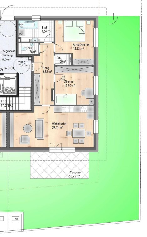 Ein absolutes Highlight ist der südseitig ausgerichtete Garten mit 118 m² Fläche – eine grüne Oase, die Ihnen ganztägige Sonne, absolute Privatsphäre und einen unvergleichlichen Lebensraum im Freien bietet. Die 13,75 m² große Terrasse bildet die perfekte Verbindung zwischen Innen- und Außenbereich und lädt zu entspannten Stunden unter freiem Himmel ein. Der Garten ist sowohl direkt vom Wohnzimmer über die elegante Terrasse als auch bequem über ein separates Gehtürl zugänglich – ein seltener Komfort.