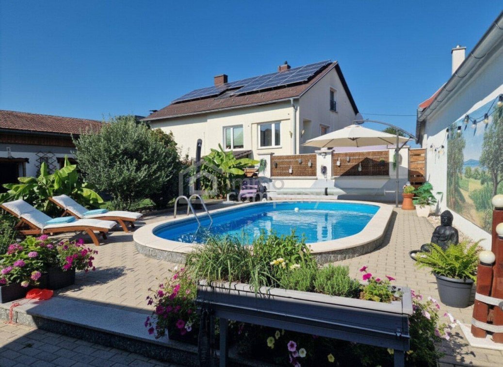 Willkommen in Ihrem neuen Traumhaus im Burgenland!Dieses exklusive Einfamilienhaus bietet Ihnen nicht nur eine großzügige Wohnfläche von 169 m², sondern auch ein komfortables und modernes Lebensumfeld für die ganze Familie.Sie erwerben ein vollsaniertes Zuhause, das keine Wünsche offenlässt. Mit insgesamt 6 Zimmern haben Sie genügend Platz, um Ihre individuellen Vorstellungen und Bedürfnisse zu verwirklichen. Ob als gemütliches Familienheim oder als Ort für kreative Entfaltung – hier finden Sie den idealen Raum für Ihre Lebensgestaltung.Die Innenräume überzeugen durch eine gelungene Kombination aus stilvollen Fliesen und warmem Laminat, die eine einladende Atmosphäre schaffen. Die moderne Einbauküche ist mit hochwertigen Geräten ausgestattet und bietet ausreichend Platz, um kulinarische Köstlichkeiten zuzubereiten. Der lichtdurchflutete Wohnbereich lädt zu geselligen Abenden mit Familie und Freunden ein und schafft Erinnerungen, die ein Leben lang halten.Das Badezimmer ist mit Fenster ausgestattet und bietet sowohl eine eine Dusche als auch eine Badewanne im Obergeschoss – ideal für entspannte Wohlfühlmomente nach einem langen Tag.Der Garten rundet dieses traumhafte Angebot ab. Genießen Sie die frische Luft und die Natur direkt vor Ihrer Haustür. Ob für Kinder zum Spielen, für Gartenpartys mit Freunden oder als Ort der Ruhe und Erholung – hier sind Ihrer Kreativität keine Grenzen gesetzt.Die Lage des Hauses ist ebenfalls ein großer Vorteil. Die Anbindung an den öffentlichen Verkehr ist durch die nahe gelegene Busverbindung hervorragend. So erreichen Sie schnell und unkompliziert die umliegenden Städte und Gemeinden. In unmittelbarer Nähe finden Sie zudem wichtige Einrichtungen wie Arztpraxen, Schulen und Kindergärten, die Ihnen und Ihrer Familie einen hohen Lebensstandard bieten.Dieses Einfamilienhaus ist mehr als nur ein Zuhause – es ist der Ort, an dem Ihre Zukunft beginnt. Lassen Sie sich von der charmanten Atmosphäre und der perfekten Lage überzeugen. Vereinbaren Sie noch heute einen Besichtigungstermin und tauchen Sie ein in Ihr neues Leben in Burgenland!Im Kaufpreis ist eine Wohnbauförderung mit ca. 60.000 € inbegriffen, welche bei Förderungswürdigkeit übernommen werden kann. Des weiteren ist das Haus klimatisiert und besitzt eine Photovoltaikanlage (zur Zeit noch Kosten pro Monat von 169€, diese können gern mit dem Kaufpreis gegengerechnet werden).Auch ein Pool darf nicht fehlen. Dieser kann mit einer installierten Wärmepumpe beheizt werden.Das Haus wurde auch schon für den Anschluss einer Wärmepumpe vorbereitet.Auch helfen wir gerne bei der Finanzierung! Sprechen Sie uns dazu an.Der guten Ordnung halber, weise ich ebenso darauf hin, dass der angebotene Preis als Verhandlungsbasis zu betrachten ist und die Abgeber gerne bereit sind über realistische Anbote zu sprechen.Der Vermittler ist als Doppelmakler tätig.Nutzen Sie die einmalige Gelegenheit, diese Immobilie zu besichtigen – sehen und erleben ist sehr viel eindrucksvoller!