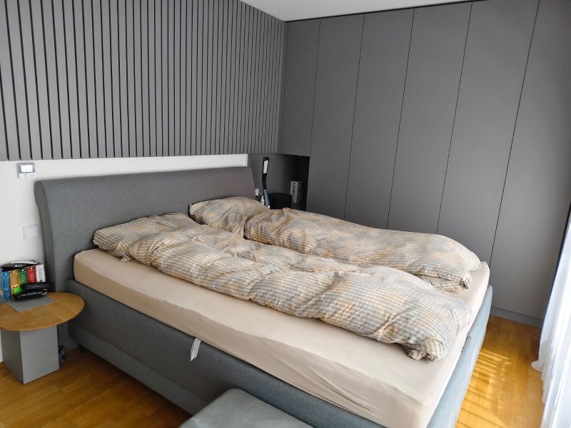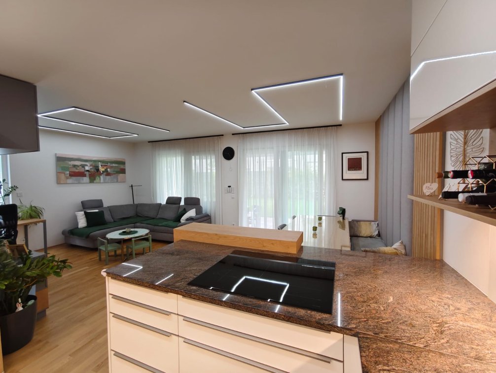 Die Einrichtung umfasst eine hochwertige Küche, maßgefertigte Möbel, Einbauschränke, Beleuchtung und mehr.