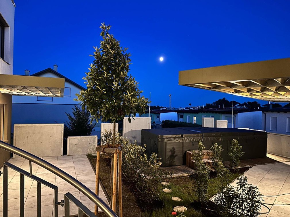 mit einer Luft/Wasser-Wärmepumpe, bestehend aus einem separaten Innen- und Außengerät, ausgestattet. Jede Wohneinheit hat somit ihren eigenen privaten Bereich. Nur der Swimspa auf der Holzterrasse und die begrünte Dachterrasse mit Fernblick stehen allen drei Einheiten zur