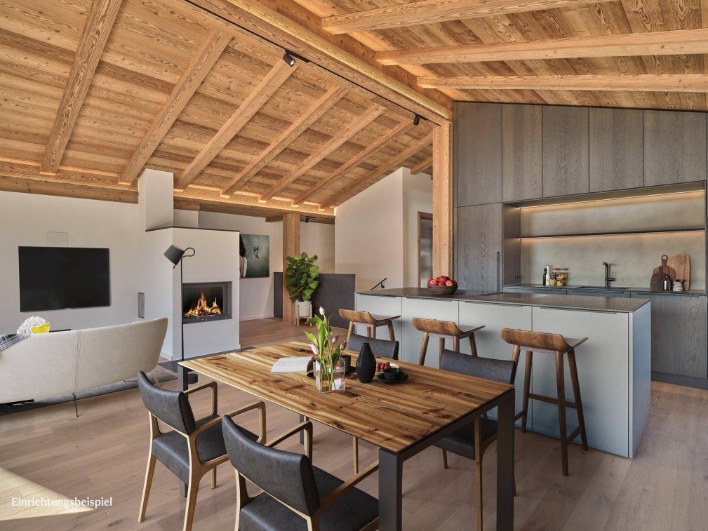 Der lichtdurchflutete Wohnbereich mit offenem Sichtdachstuhl und Kamin schafft eine besonders behagliche Atmosphäre. Edle Holz- und Feinsteinböden in Kombination mit einer Fußbodenheizung sorgen für stilvolle Wärme und Wohnqualität. Die hochwertige Küche mit Geräten von Miele und Liebherr erfüllt höchste Ansprüche.