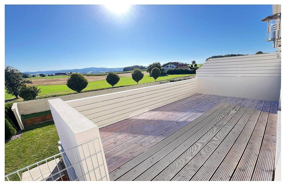 Auf der großzügigen Terrasse mit traumhaften Fernblick Richtung Sonnenaufgang können Sie das gesellige Beisammensein oder Ihre Privatsphäre genießen.
