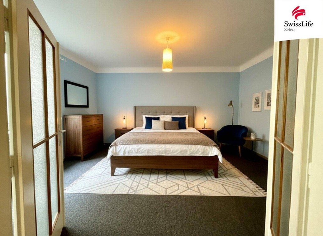 Das Wohnzimmer bildet das Herzstück der Wohnung und führt direkt in das rund 20 m² große Hauptschlafzimmer – großzügig, ruhig und mit schönem Ausblick auf die Grünanlage.Zweites Schlafzimmer