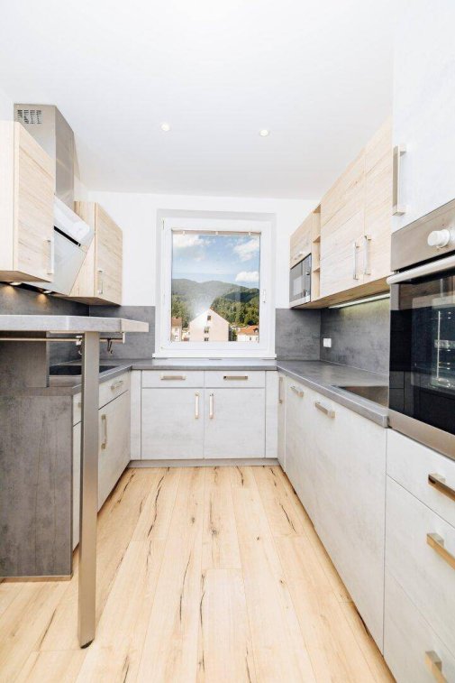 Die extra begehbare Küche ist mit E-Herd, Ceranfeld, Mikrowelle, Geschirrspüler sowie Kühl-/Gefrierkombination ausgestattet. Spots sorgen für modernes Licht und ein angenehmes Arbeitsumfeld.Abstellraum & separates WC – beide mit Tageslicht