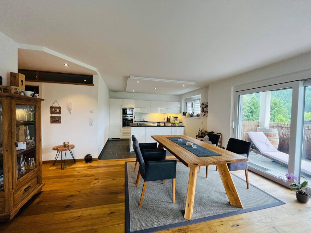 Die Wohnung verfügt über eine hochwertige Haka-Küche mit Kochinsel im großen und hellen Wohn-Essbereich. Vom Wohn-Essbereich hat man Zugang zum schönen, südwestseitig ausgerichteten und rd 15m² großen Balkon. Die Wohnung verfügt zudem über zwei westseitig ausgerichtete Schlafzimmer, ein sehr großes Badezimmer mit Badewanne, Dusche und Bidet, ein separates WC, einen geräumigen Vorraum und einen großen Abstellraum. Die beiden Schlafzimmer bieten zudem Zugang auf einen zweiten, rd 7m² großen und westseitig gelegenen Balkon. Alle Zimmer bieten einen wunderbaren Ausblick auf die Tiroler Bergwelt. Die Wohnung wurde hochwertig vom Tischler mit Einbaumöbeln eingerichtet.