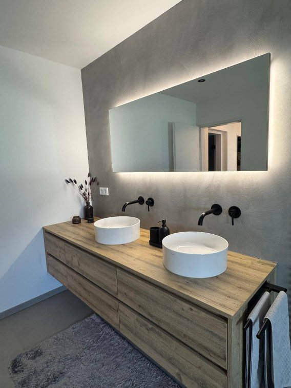 • Fugenloser Mikrozementanstrich an den Wänden und in der Dusche