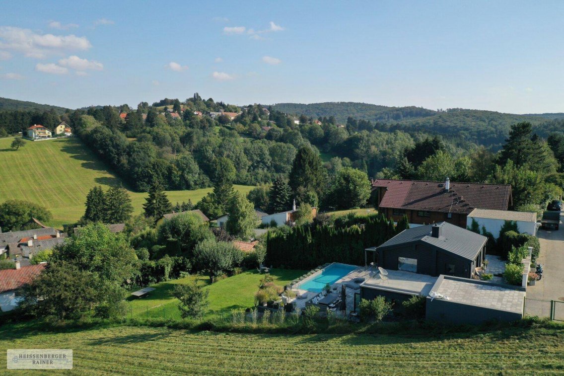 Am Ende einer Sackgasse - diskret und elegant inmitten herrlicher Natur gelegen - eröffnet sich ein Designhighlight, das auf leichte, ungezwungene und perfekt harmonische Weise den Sommer im Wienerwald neu und zeitgemäß interpretiert. Alle Räume bieten traumhafte Ausblicke über den Garten, den Pool und die Wiesen und Wälder der Umgebung - von Sonnenaufgang bis Sonnenuntergang lässt sich dieser wirklich besondere Rückzugsort entspannt genießen!Das Haus und die Gartenlandschaft wurden 2018-2020 mit viel Liebe und Feingefühl neu ausgebaut und erweitert. Highlight ist der lichtdurchflutete, flexibel aufgeteilte Wohn- und Essbereich (ca. 62m²) erweitert durch die riesige Poolterrasse. Mit den großen Glastüren und den schönen Ausblicken verschmelzen Innen und Außen zu einem perfekten Ganzen!Der Pool bindet sich harmonisch in die Gesamtgestaltung ein, ist beleuchtet und mit 11 Metern Länge auch wirklich zum Schwimmen geeignet. Der Garten ist in drei großen Terrassen angelegt, perfekt für Sport, zum Spielen oder einfach zum Entspannen mit einem Buch im Schatten eines alten Baumes.Egal zu welcher Jahreszeit, in diesem wunderbaren Haus finden Sie immer Zeit, Gelegenheit und den richtigen Platz zum Entspannen, Genießen und einfach sich Selbst sein! Es ist die ideale Ergänzung zur Wohnung in der Stadt und mit seinem konsequenten und klaren Design mit geringem Aufwand entspannt zu bewirtschaften.Aufteilung:Garten-/Poolebene:herrlich großer Wohnbereich (gesamt ca. 62m²)traumhafte PoolterrasseTischlerküche (voll ausgestattet)Badezimmer mit Dusche und Toilettekleiner WirtschaftsbereichObere Ebene:Eingangsbereichgroßes Schlafzimmer mit traumhaftem Panoramablick und großen FensterflächenBadezimmer (zwei Waschbecken, Badewanne, Toilette)weiteres schönes Schlafzimmer mit Blick über die LandschaftTerrasseDurch seine zentrale Lage ist das Haus über mehrere Routen aus Wien schnell erreichbar ist (1170 Wien über Neuwaldegg und über 1190 Wien Richtung Klosterneuburg bzw. über Sievering). Die öffentlich Anbindung nach Wien ist mit dem Bus 445 ohne Umsteigen ideal gegeben.Die unmittelbare Umgebung bietet perfekte Harmonie aus Wald und Wiesen mit unzähligen Wander- und Spazierwegen und hochwertiger Gastronomie.Weitere Bilder und alle weiterführenden Informationen erhalten Sie gerne auf Anfrage. Ich freue mich auf ein persönliches Gespräch!Courtagepassus:Der Anspruch auf Provision in der Höhe von 3% des Kaufpreises zzgl. Umsatzsteuer entsteht mit der Rechtswirksamkeit des vermittelten Geschäfts. Fällig ist die Provision mit der Unterfertigung des Kaufvertrages. Die Heissenberger & Rainer Immobilien GmbH erhält einen unmittelbaren Zahlungsanspruch gegenüber dem Käufer. Alle Angaben zum Objekt sind ohne Gewähr und basieren auf Informationen, die vom Eigentümer der Liegenschaft zur Verfügung gestellt wurden. Die Heissenberger & Rainer Immobilien GmbH übernimmt keine Gewähr für die Vollständigkeit, Richtigkeit und Aktualität dieser Angaben.