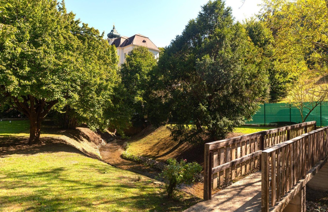 Ein besonderes Highlight der Liegenschaft ist die Dürre Liesing, die sich sanft durch das Grundstück schlängelt, und dem Garten eine unvergleichliche Atmosphäre verleiht. Entlang des Wasserlaufs sind die Ufer liebevoll mit Natursteinen befestigt und von altem Baumbestand umrahmt, der im Sommer für angenehmen Schatten sorgt und zugleich Privatsphäre schafft. Ein rustikaler Holzsteg verbindet die beiden Gartenseiten miteinander und setzt einen charmanten Akzent im Außenbereich.