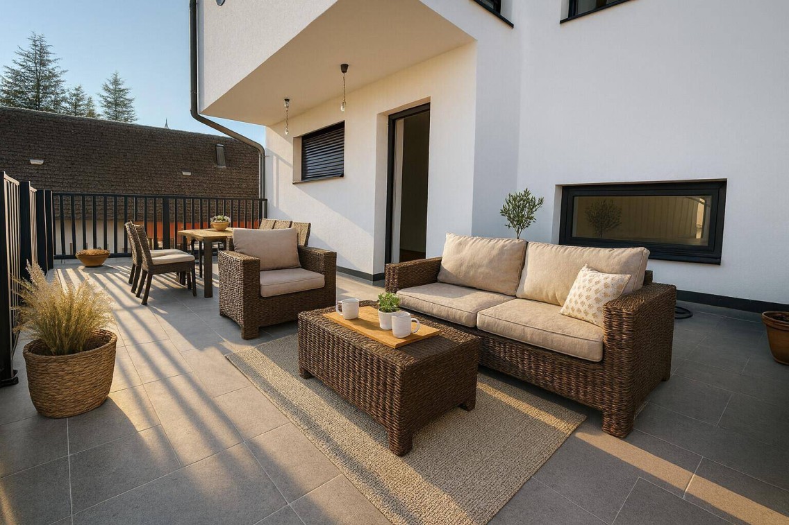 Der lichtdurchflutete Wohn- und Essbereich bildet das Herzstück des Hauses und schafft durch große Fensterflächen ein angenehmes Wohngefühl. Zwei Loggien und eine großzügige Terrasse erweitern den Wohnraum nach außen und laden zum Entspannen ein – ganz ohne aufwändige Gartenarbeit.