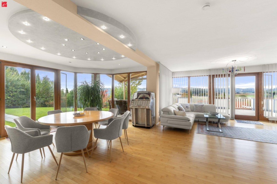 Schon beim Betreten offenbart sich die durchdachte Architektur und das harmonische Zusammenspiel aus Glas, Licht und Raum. Großzügige Glasfronten schaffen ein lichtdurchflutetes Ambiente und bringen die traumhafte Aussicht direkt ins Wohnzimmer!Der moderne Eingangsbereich mit Gäste-WC führt in den offenen, großzügigen Wohn- und Essbereich, der durch elegante Glasfronten, eine stilvolle Raumhöhe und den direkten Zugang sowohl zur sonnigen Westterrasse als auch zum ruhigen Garten begeistert. Hier genießen Sie absolute Privatsphäre – das angrenzende Waldstück sorgt für idyllische Ruhe – und der Pool lädt zu entspannten Stunden in der Sonne ein.Im Obergeschoss setzt sich das exklusive Wohngefühl fort: Das Sonnenschlafzimmer mit stilvoller Einrichtung, begehbarem Kleiderschrank und Zugang zum Ostbalkon verspricht jeden Morgen den perfekten Start in den Tag – mit Kaffee und Blick über den Pool.