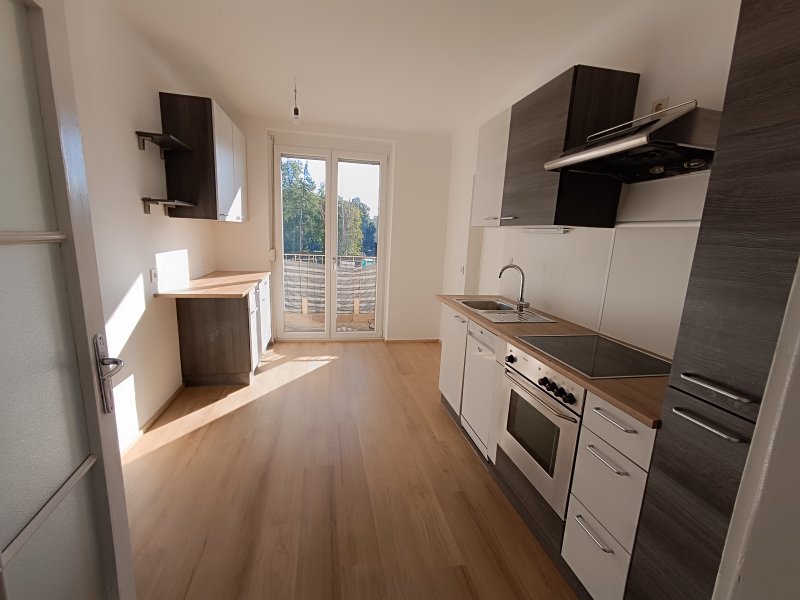Die geräumige Küche bietet ausreichend Platz zum Kochen. Von der Küche aus kommt man auf den östlich ausgerichteten Balkon.