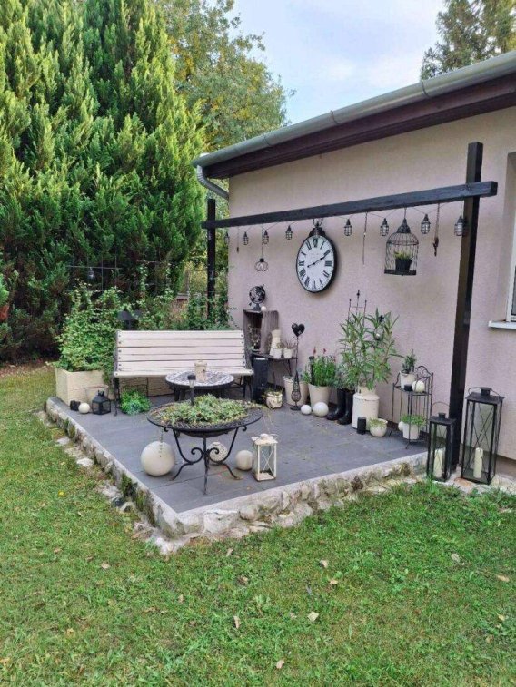 Das 66m2 große Haus wurde generalsaniert und ist in einen top Zustand.Es wurde mit neuen Fenstern inkl. Fliegengitter, neuem Dach, neuer Fassade inkl. Wärmedämmung, neuen Sanitär- und Elektroleitungen ausgestattet.Vom Eingang aus betritt man das Vorzimmer, das durch eine halbhohe Mauer vom Wohnzimmer, welches man über eine Stufe erreicht, getrennt ist.Die Küche ist optimal eingerichtet und mit einem Kasten für Warmwasserspeicher und Waschmaschine versehen.Neben der Küche befindet sich das geräumige Badezimmer mit Dusche und WC.Vom Vorzimmer aus gelangt man in ein Zimmer, welches zur Zeit als Arbeitszimmer genutzt wir. Anschließend befindet sich das Schlafzimmer mit begehbarer Garderobe ( ein .Das 650m2 große Pachtgrundstück, das vorletzte der Wohnsiedlung, befindet sich in absoluter Ruhelage, umgeben von Feldern und Wäldern.Der Garten wurde mit viel Liebe zum Detail gestaltet.Neben einer künstlichen Quelle, die von zahlreichen Vögeln und Insekten besucht wird, gibt es einen Pool mit 5,5m Durchmesser und Sonnendeck, ein Gartenhäuschen, das als Lagerraum und für die Pooltechnik genutzt wird. Eine verflieste Terrasse, die am Nachmittag herrlich schattig ist, ein Hochbeet für Gemüse- und Kräuteranbau, hinter dem Carport ein Holzhäuschen für Rasenmäher und Holzvorrat.