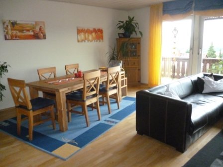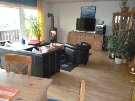 EG: große, bodentiefe Fensterfront mit traumhaftem Ausblick, Kaminofen, Einbauküche, langer Balkon über die gesamte Hausbreite