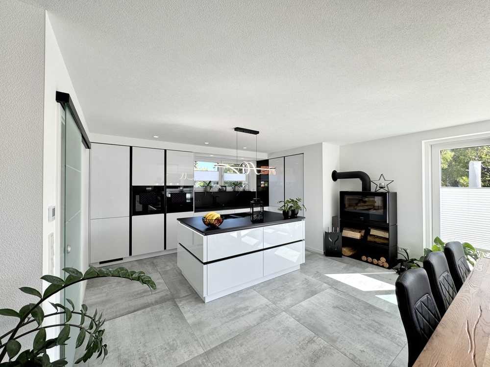 Im Erdgeschoss bildet der über 40 m² große Wohn-, Ess- und Kochbereich das Herzstück der Immobilie. Bodentiefe Fenster lassen viel Tageslicht herein und öffnen den Blick ins Grüne. Die moderne Einbauküche ist offen und funktional gestaltet, sodass Kochen und geselliges Beisammensein harmonisch ineinander übergehen. Ein stilvoller Kamin sorgt darüber hinaus für Gemütlichkeit an kalten Tagen. Ergänzt wird diese Etage durch ein flexibel nutzbares Arbeits- oder Gästezimmer, ein modernes Duschbad sowie einen praktischen Hauswirtschaftsraum – ideal für den Alltag einer Familie.