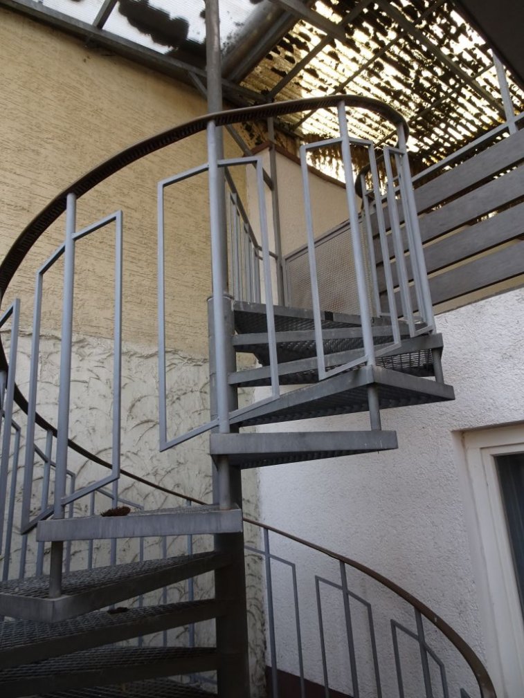Die Wohnung im OG erreicht man über eine außenliegende, überdachte Wendeltreppe.