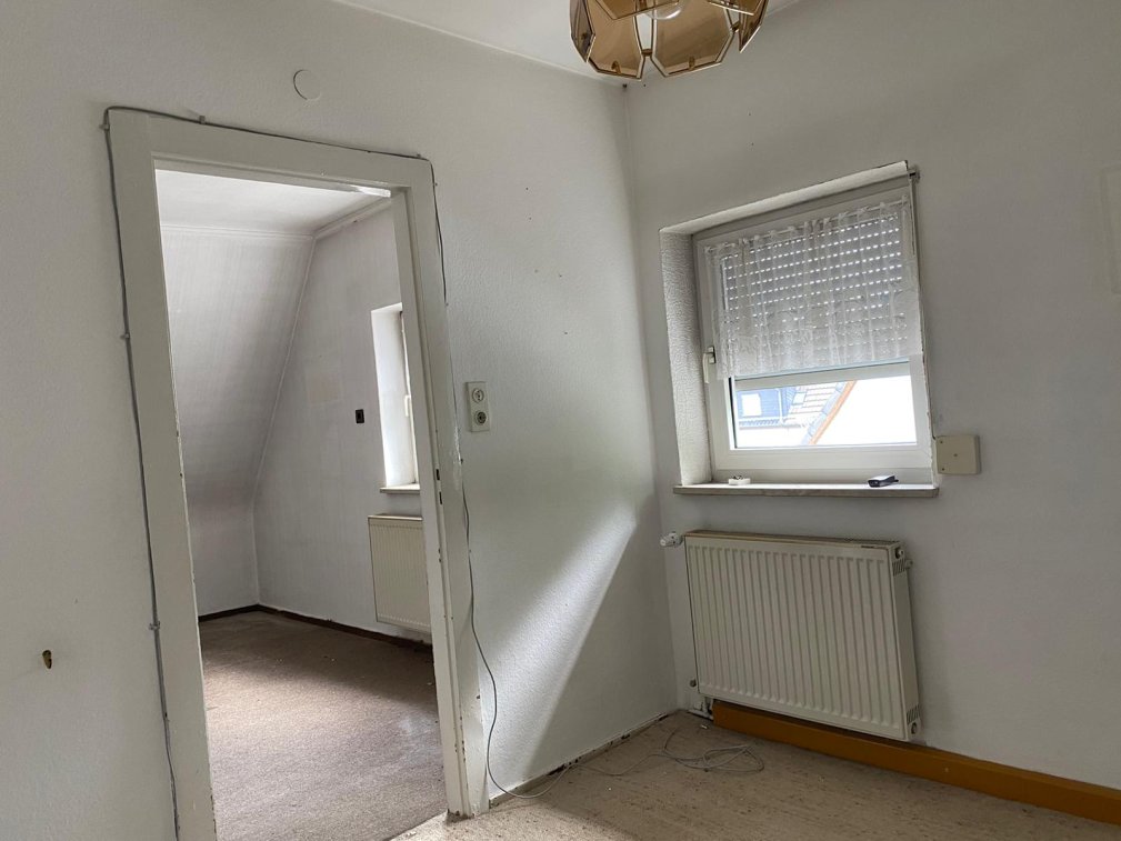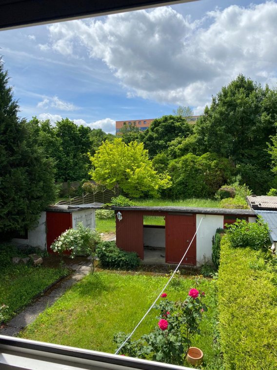 Über den Eingangsbereich, welcher Platz für eine kleine Garderobe bietet, gelangen Sie in einen weiteren kleinen Flur, der die separate Küche, das Wohnzimmer und das WC zugänglich macht. Das Wohnzimmer ist zum Garten ausgerichtet, und an der Nachbarbebauung kann man sich ausmalen, wie auch hier ein Durchbruch zum direkten Garten mit Terrasse aussehen könnte. Das Obergeschoss (1 Stock) erreichen Sie durch eine Holztreppe, die in einer Art Vorderflur mündet und derzeit ein Einbauschrank steh. Die Fenster bieten ausreichend Licht. Nach dem Flur gelangt man nach links in das Tageslicht-Bad, rechts in das Schlafzimmer (ohne Dachschräge) mit Blick auf den Garten und geradeaus in ein weiteres kleines Wohnzimmer (Dachschräge) mit direkt angrenzendem Bürozimmer (Dachschräge). Gern mehr Infos per Mail