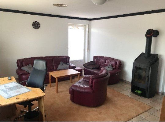 Vom Wohnzimmer im Obergeschoss gelangt man auf eine Terrasse und einen Balkon. Das Zimmer verfügt über einen Kaminofen. Von diesem Raum aus gelangt man über eine Holztreppe in das ausgebaute Dachgeschoss, in dem sich ebenfalls ein Kaminofen befindet.