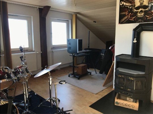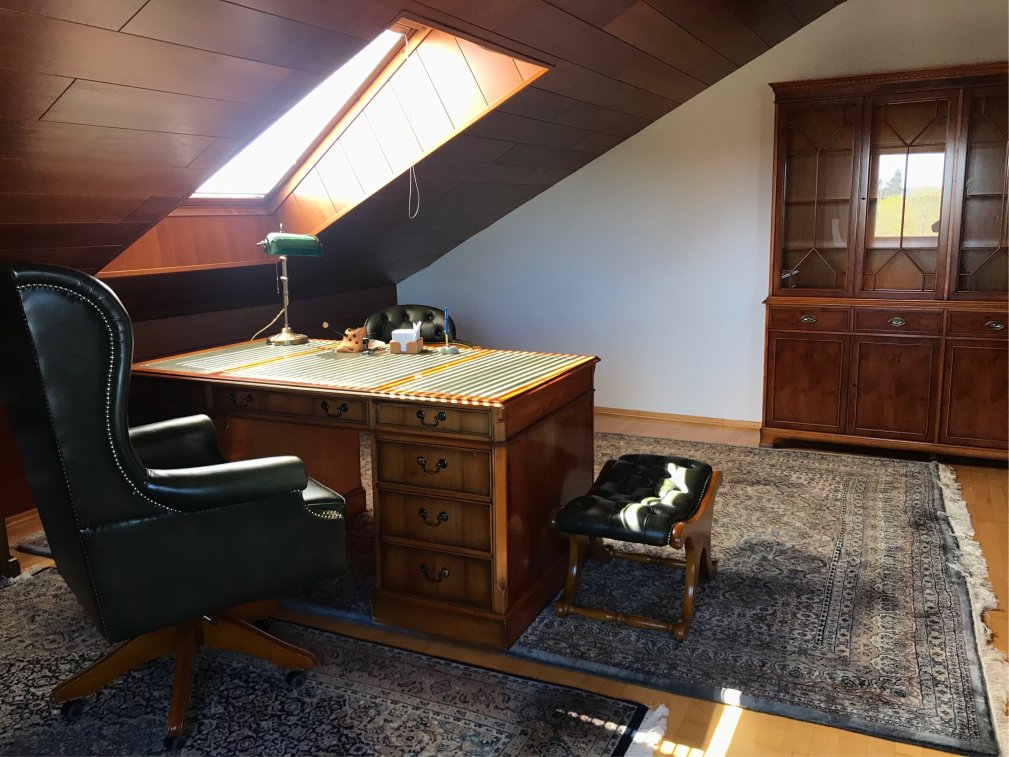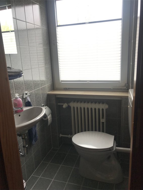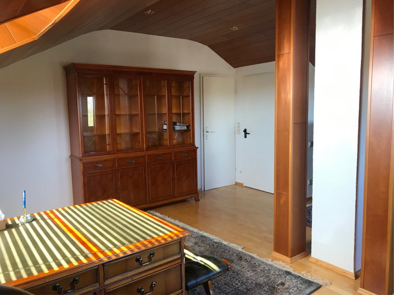 Die zweite, abgeschlossene, Dachgeschosshälfte ist über das Treppenhaus zu erreichen. Diesem großflächigen Raum schließt sich noch ein Dusch-WC an.