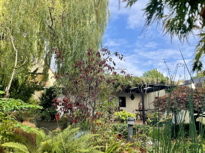 865qm, 60,9 m lang und durchschnittlich 14,2 m breit; an einer ruhigen Wohnstraße in Lurup gelegen, ist das Grundstück mit Westlage der perfekte Rückzugsort, ganz in der Nähe des Zentrums. Die Sonne wandert im Laufe des Tages von der Hausfront zum hinteren Teil des Grundstücks, wo sich der große Wohlfühlgarten, Garage und Hinterhof befinden. Der idyllische Garten ist rundum eingefriedet und durch den alten Baumbestand fast blickgeschützt. Eine überdachte Terrasse und der liebevoll angelegte Teich laden zum Verweilen ein.